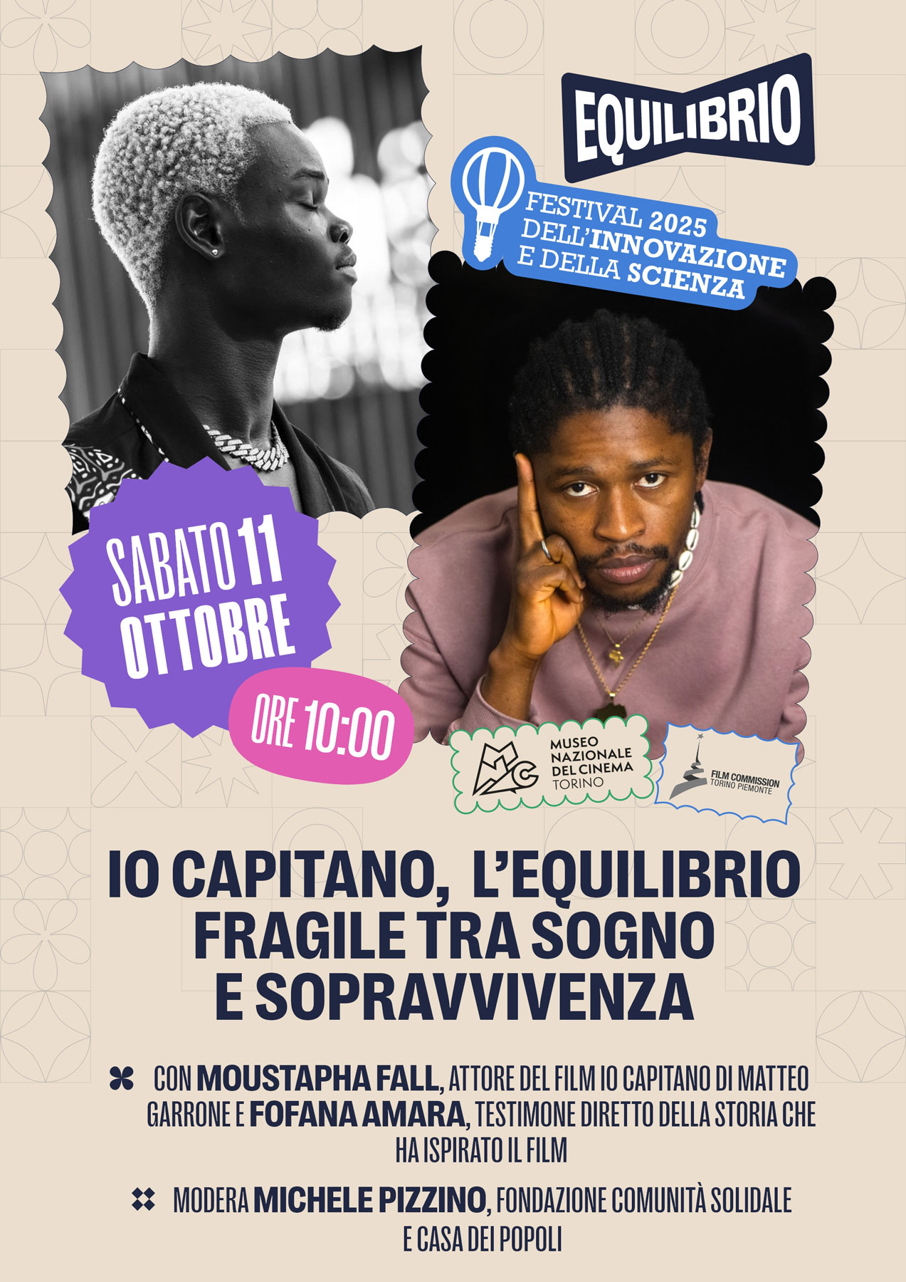 Un incontro per approfondire le tematiche al centro del film “Io Capitano” e riflettere sulle rotte migratorie contemporanee tra racconto cinematografico e realtà. A dialogare saranno Moustapha Fall, attore protagonista del film, e Fofana Amara, il giovane che ha realmente vissuto il viaggio raccontato da Matteo Garrone, con la moderazione di Michele Pizzino – da anni impegnato nell’ambito dell’accoglienza e dell’inclusione sociale sul territorio di Settimo Torinese. La conversazione avrà un focus particolare sul valore della narrazione e del racconto come strumenti di consapevolezza, confronto e partecipazione attiva. L'evento è realizzato in collaborazione con Museo Nazionale del Cinema e Film Commission Torino Piemonte.